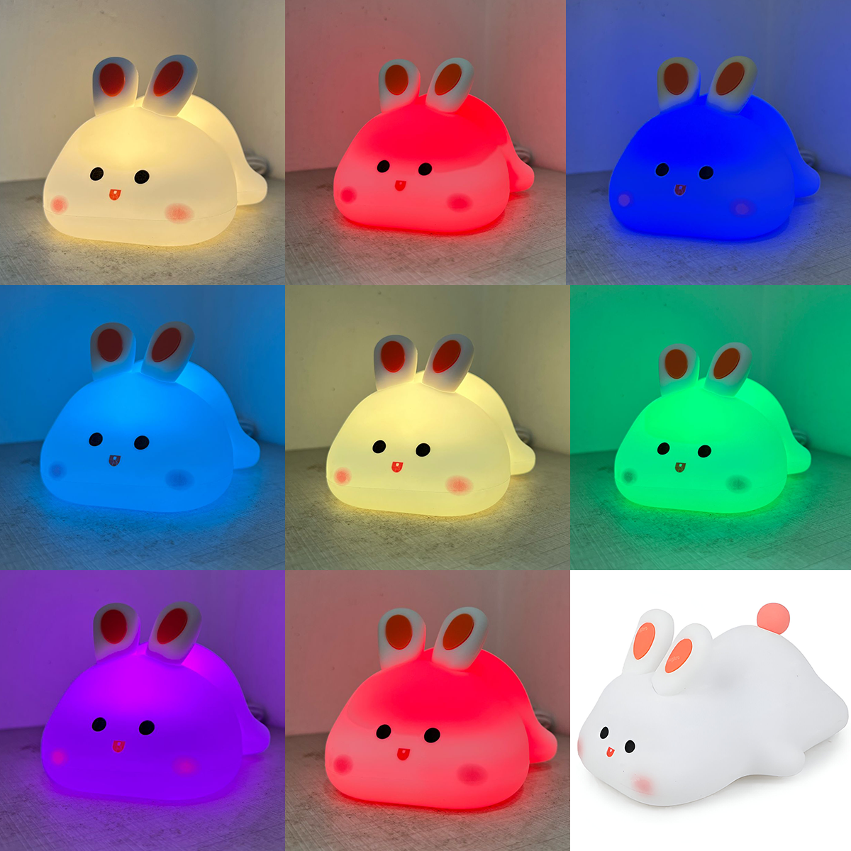 Charming Bunny Night Light for All Ages – This delightful LED night light, shaped like a bunny, is crafted to infuse any space with warmth, comfort, and a hint of enchantment. Featuring an endearing expression, a gentle glow, and a soft, squeezable texture, it serves as an ideal bedside companion for children seeking comfort and for adults who appreciate stylish, cozy decor. It is perfect for nurseries, children's bedrooms, playrooms, and can also function as a soothing nightlight for adults.