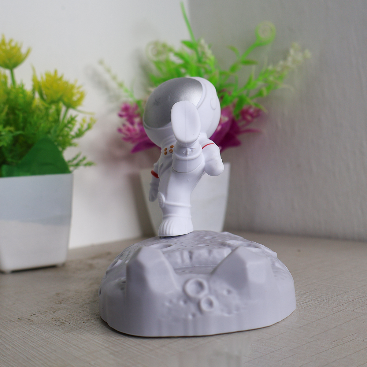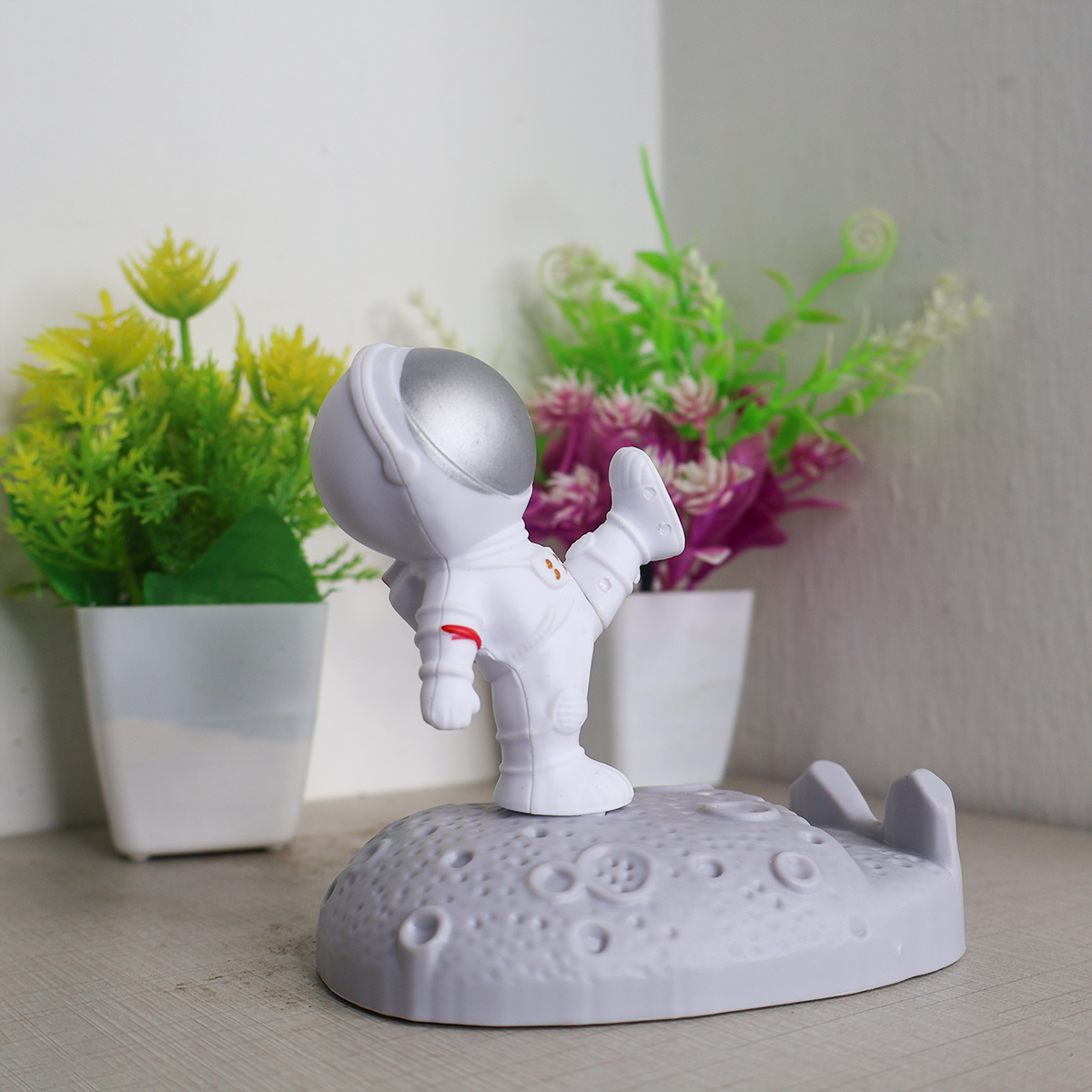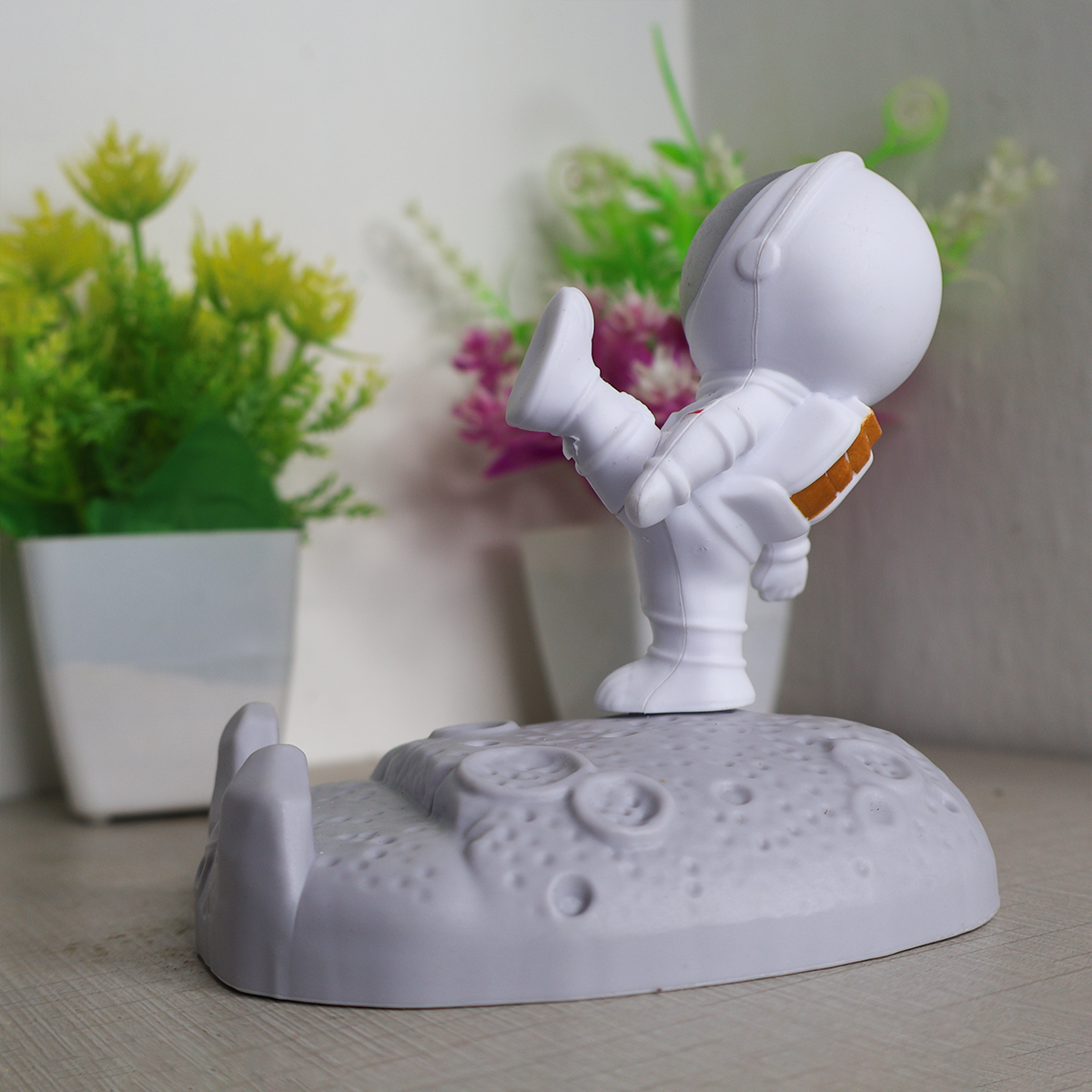 This mobile holder showcases a charming astronaut figurine perched on a lunar landscape, bringing a fun element to your desk or workspace. Whether for yourself or a loved one, this quirky mobile holder makes for a delightful and thoughtful present.